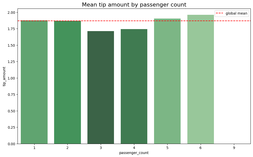 Tip amounts show minimal variation based on passenger count. While there’s a noticeable dip for four-passenger rides, this is anticipated due to the lower frequency of such rides in the dataset, second only to rides with zero passengers.