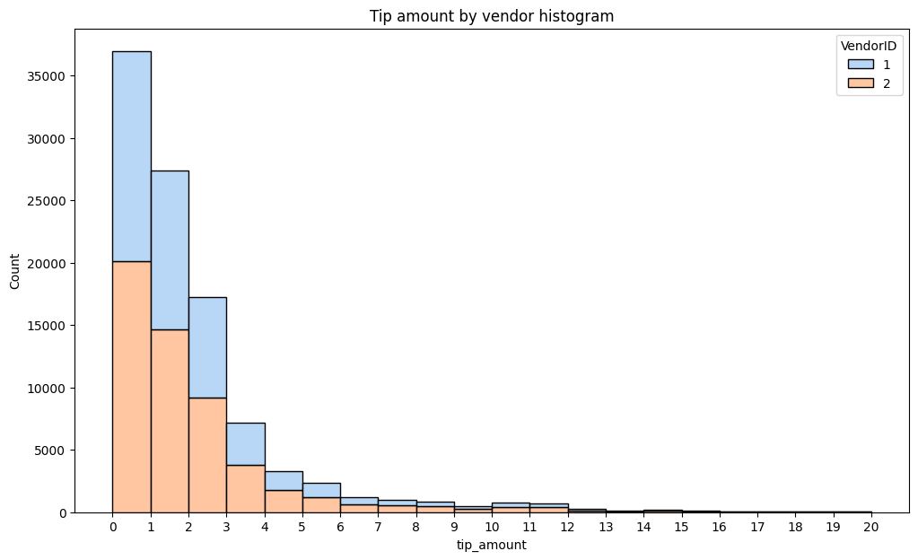 Separating the tip amount by vendor reveals that there are no noticeable aberrations in the distribution of tips between the two vendors in the dataset. Vendor two has a slightly higher share of the rides, and this proportion is approximately maintained for all tip amounts.