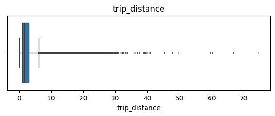 sns.boxplot(data=None, x=df['trip_distance'], fliersize=1)