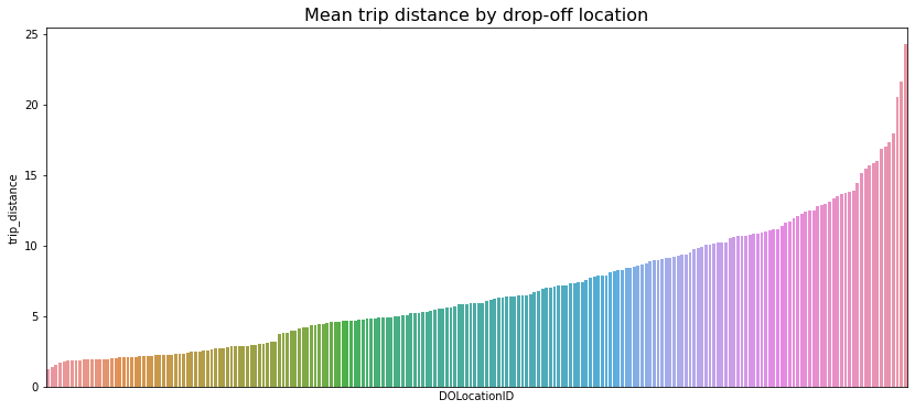 plt.title('Mean trip distance by drop-off location', fontsize=16);