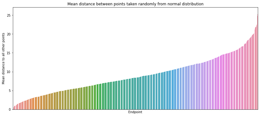 ax.set_title('Mean distance between points taken randomly from normal distribution');