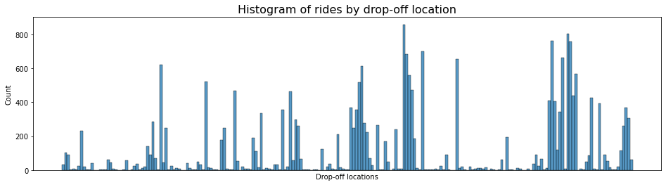 plt.title('Histogram of rides by drop-off location', fontsize=16);